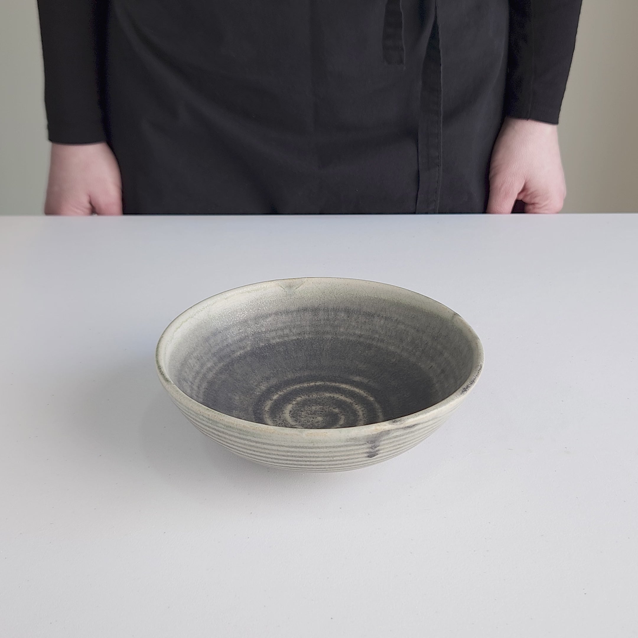This artisan ceramic bowl is crafted from white stoneware clay and shaped with precision on the potter’s wheel. Its soft beveled edges gently lead into a stable base, creating a silhouette that’s both modern and timeless. The hand-carved exterior, made using a simple tool, gives the surface an organic, tactile quality that feels at home in both contemporary and rustic settings.