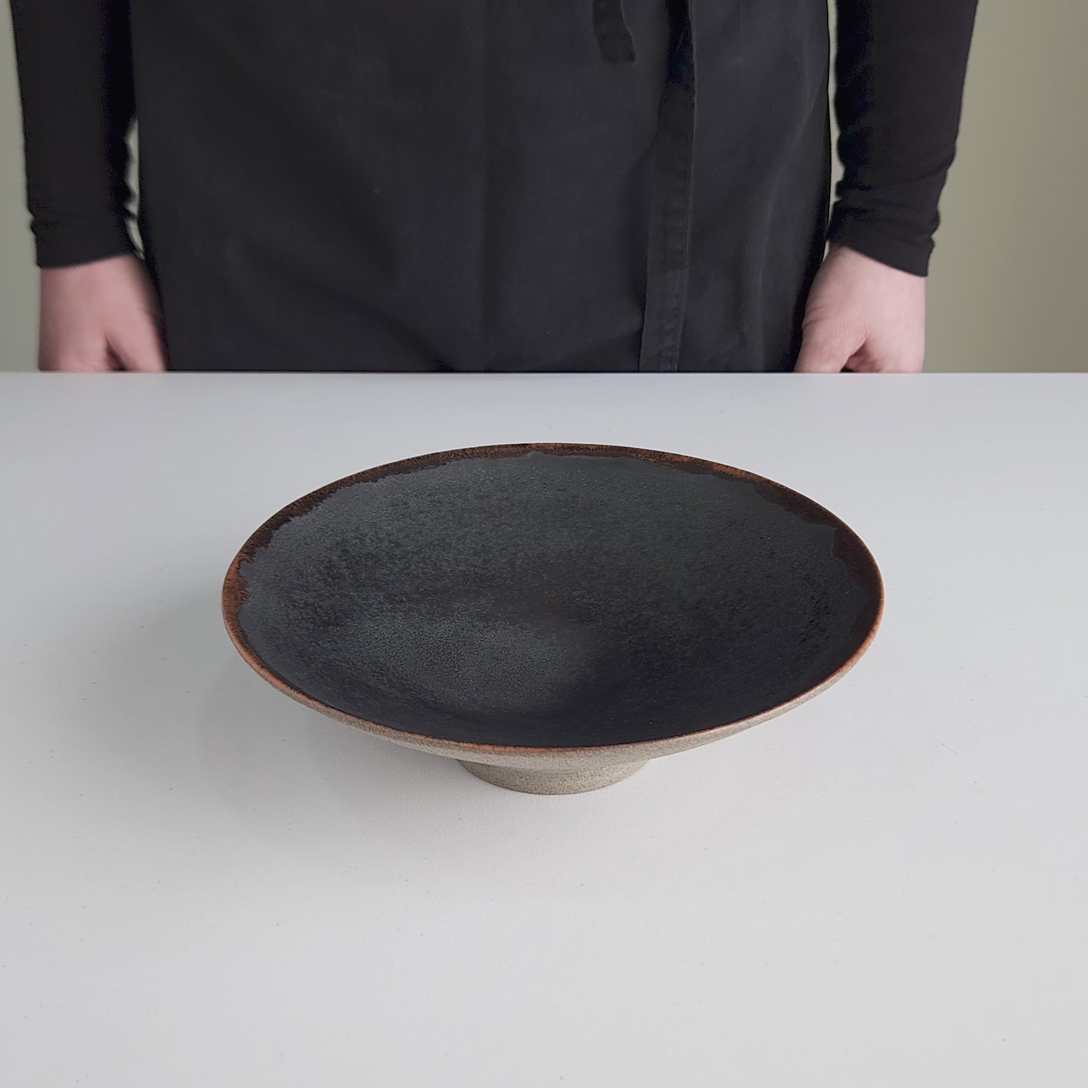 The Tatria Night artisanal ceramic plate combines elegance, craftsmanship, and functionality, making it an ideal choice for luxury dining settings. Each piece is handcrafted from high-quality dark stoneware clay and shaped on the potter’s wheel with meticulous attention to detail. The interior is coated in a deep black matte glaze that serves as a sophisticated backdrop for any culinary creation, while the rim is finished with a warm orange semi-transparent glaze. This subtle color transition adds depth and character, creating a plate that is visually captivating.