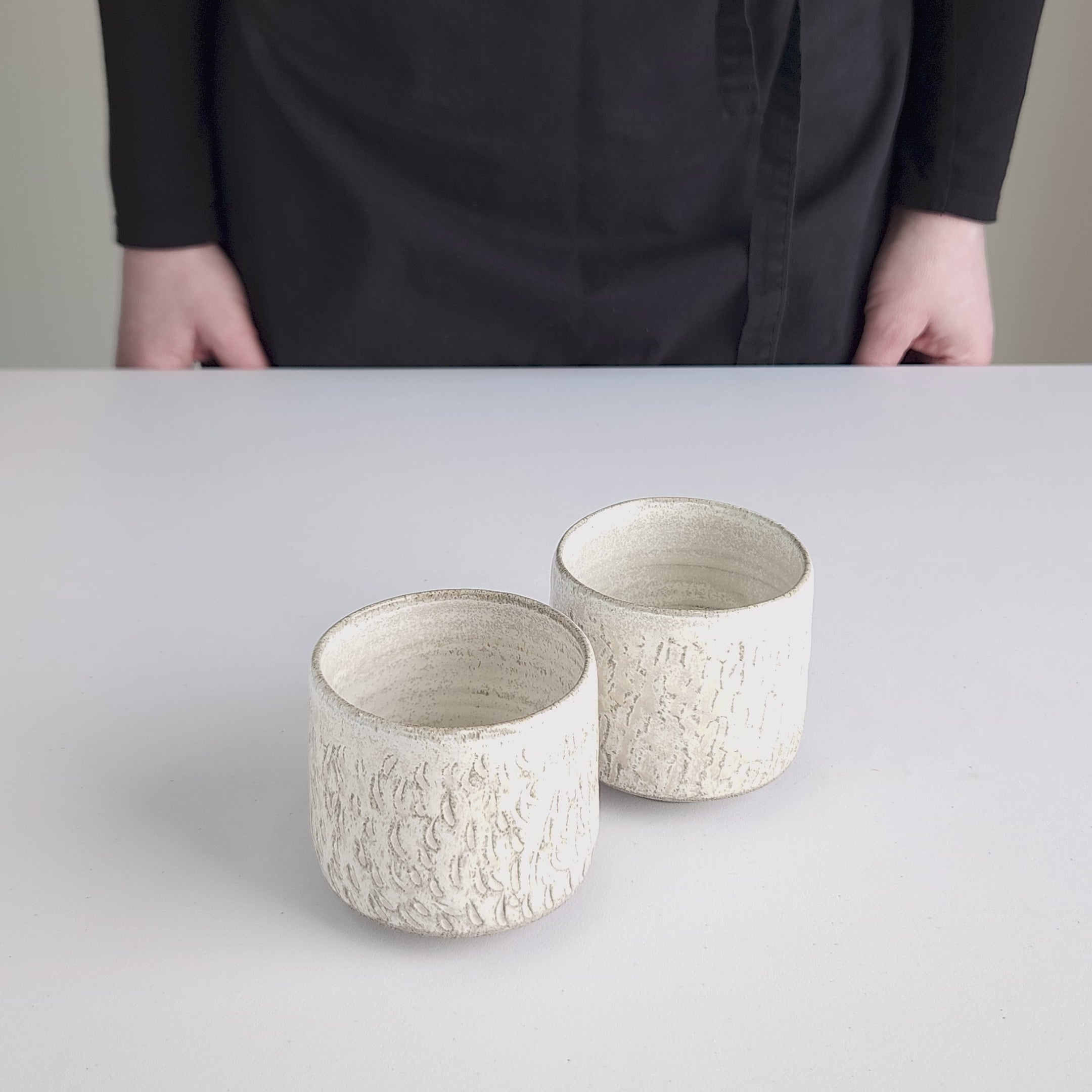 This Set Eglantine is a pair of ceramic espresso cups designed to combine everyday function with handmade artistry. Each cup is carefully shaped on the potter’s wheel using strong, dark stoneware clay, giving it durability and a natural feel. The design includes flat edges and a stable bottom, slightly lifted on a hoof-like base that makes the cups comfortable to hold and visually elegant.