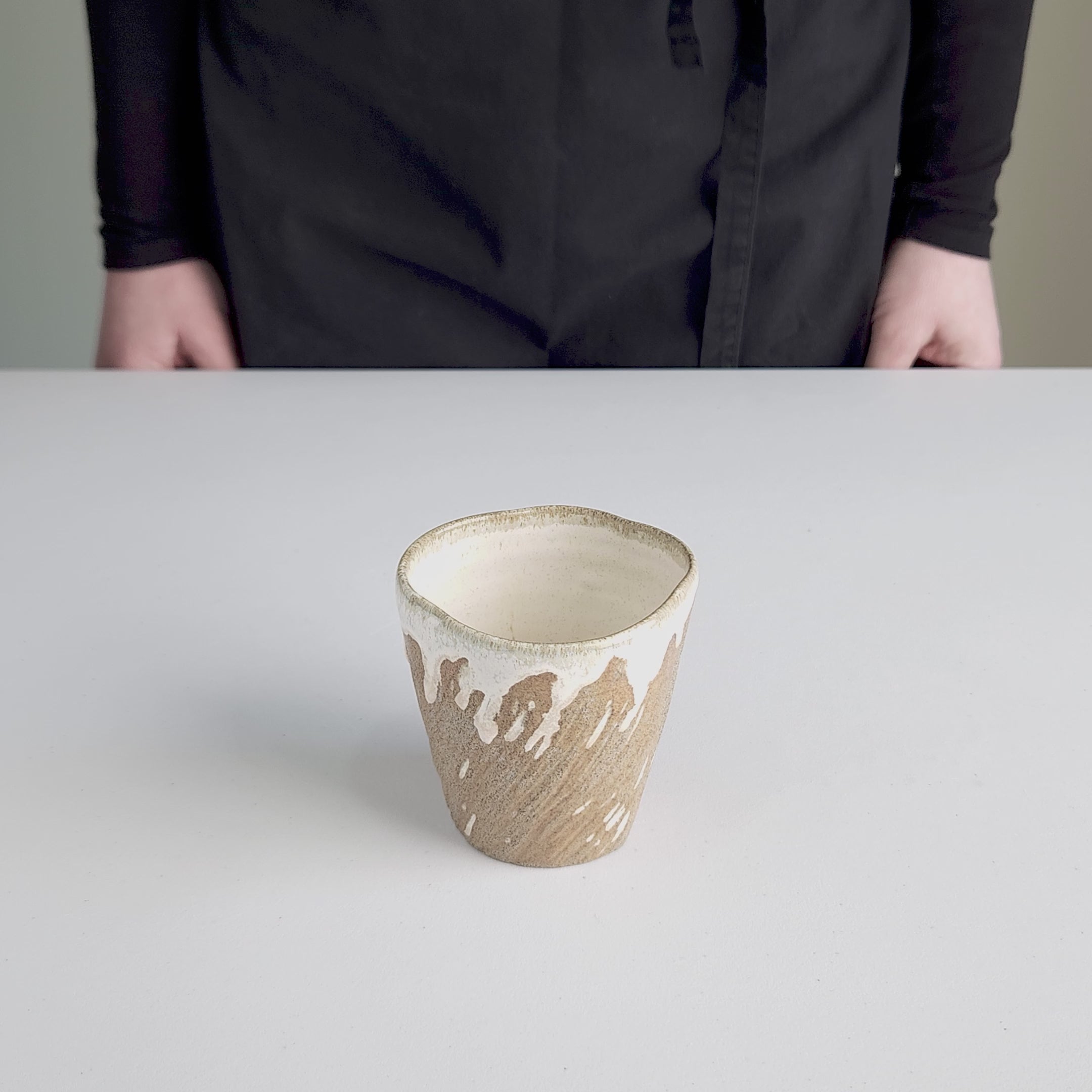 To highlight the contrast between earthiness and refinement, the mugs are partially coated with a flowing semi-gloss white glaze. The glaze drips organically down the surface, ensuring that every mug has a one-of-a-kind finish. This natural variation makes each piece unique, a collectible example of handmade pottery. Designed for enjoying espresso, they are also versatile enough for tea, matcha, or even small servings of fine desserts.