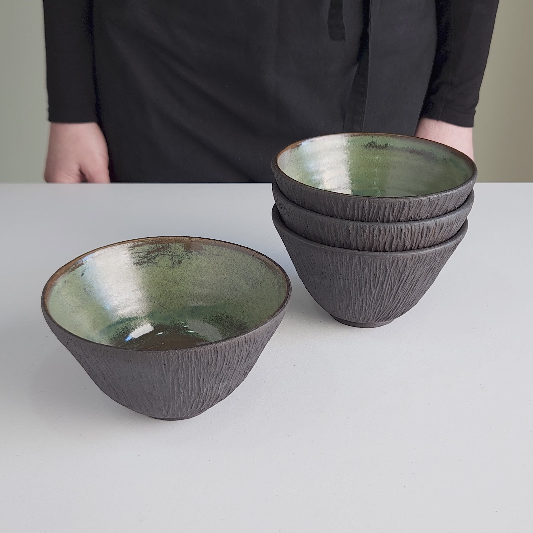 Sculpted for elegance and function, this handmade ceramic bowl is a refined addition to any luxury dining space. Crafted from black stoneware clay and shaped on the potter’s wheel, its straight beveled edges and sturdy base reflect precision and artistic mastery. The deep green glazed interior contrasts beautifully with the raw, textured exterior, creating a bold yet sophisticated look.