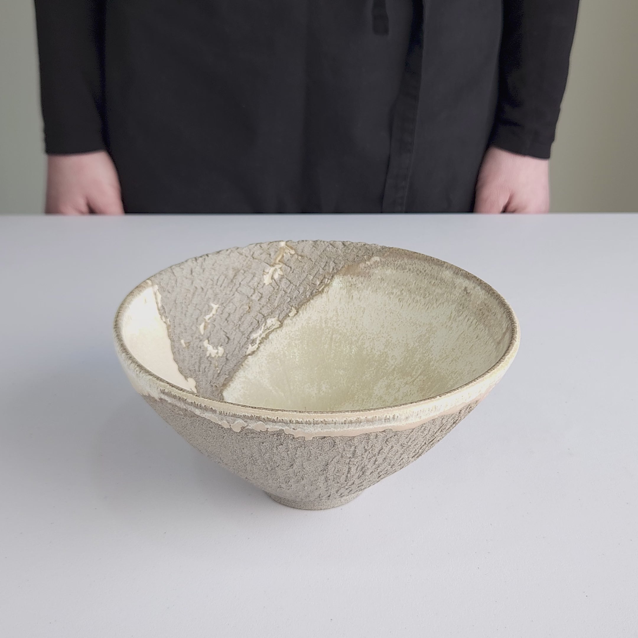 The interior is partially glazed with a soft, matte ivory finish, offering a gentle contrast to the raw, earthy exterior. The design continues slightly into the interior, blending carved texture and smooth surface in a balanced, modern aesthetic. This bowl is not just functional—it’s a piece of handmade decor designed to enhance any space.
