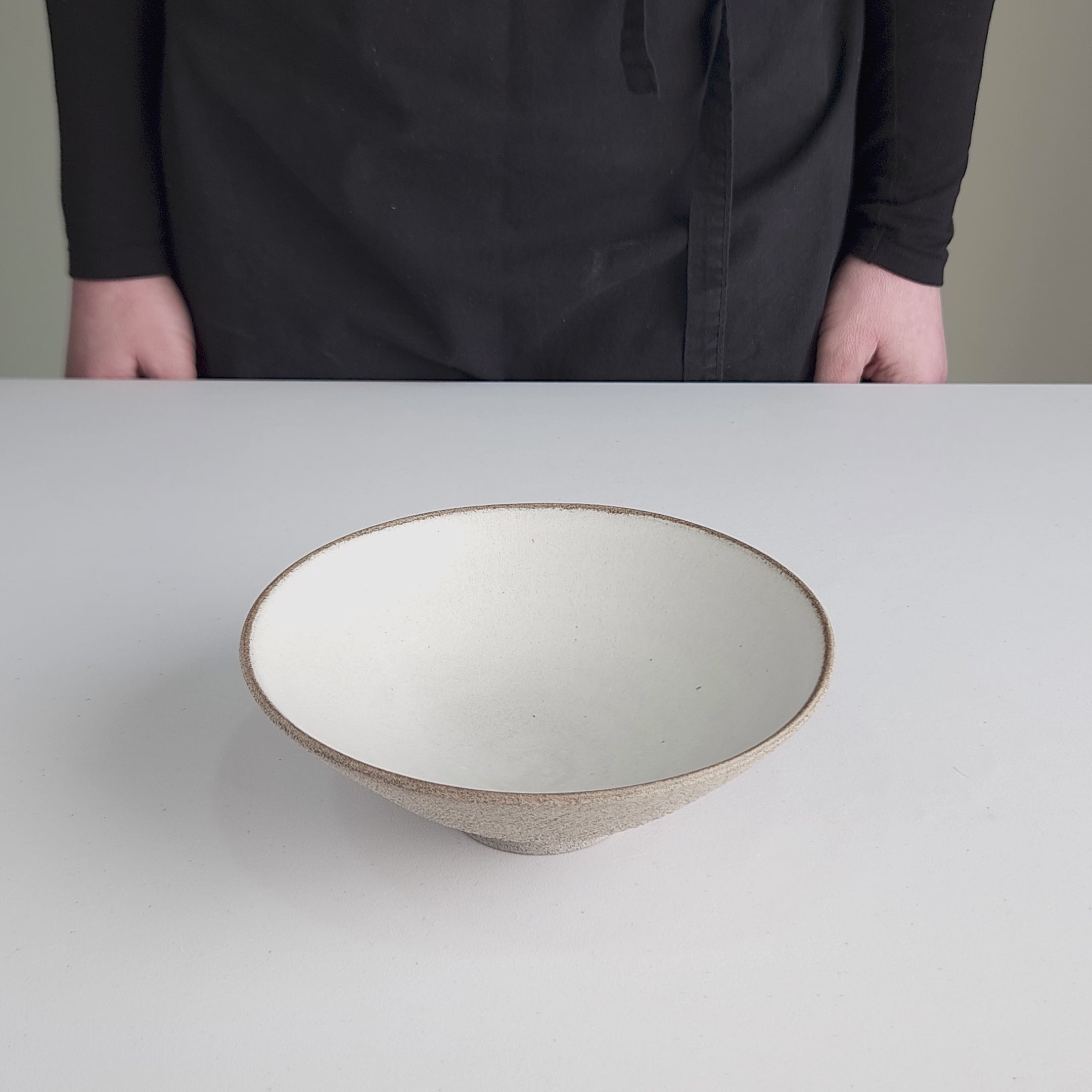 Made from high-quality dark stoneware clay and shaped on a potter’s wheel, this bowl features sharply beveled edges that taper down to a narrow base. The interior is coated with a smooth white matte glaze, offering a minimalist backdrop for bold ingredients and artistic plating. The exterior is left unglazed and meticulously carved by hand, highlighting the raw beauty and tactile appeal of natural clay.