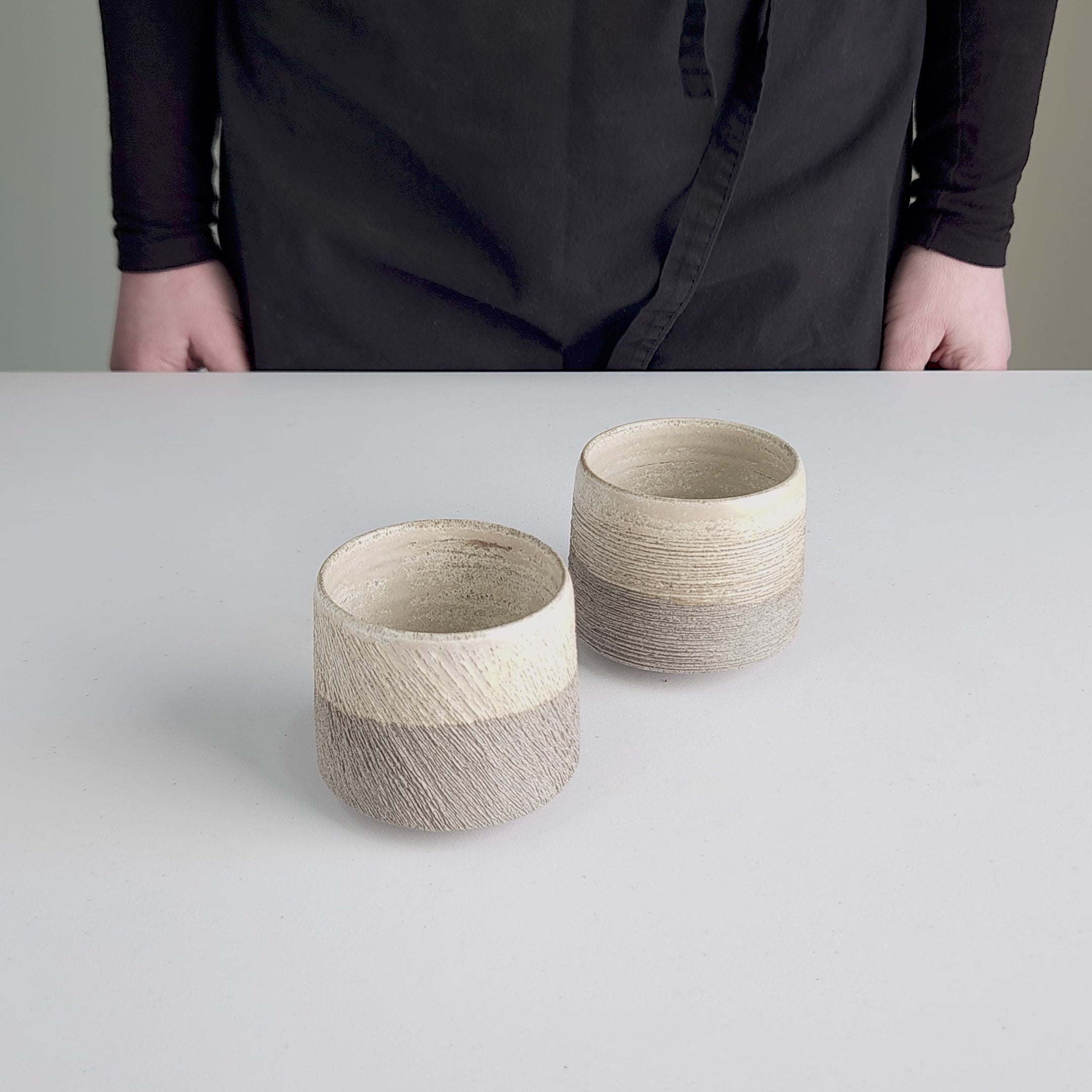 Set Livamona brings together two elegant pottery coffee mugs, each handcrafted with precision from dark stoneware clay on the potter’s wheel. The cups are shaped with flat edges and a subtle angled base, ensuring both balance and a contemporary silhouette. Every surface is thoughtfully carved by hand, creating a tactile texture that enhances its natural charm.