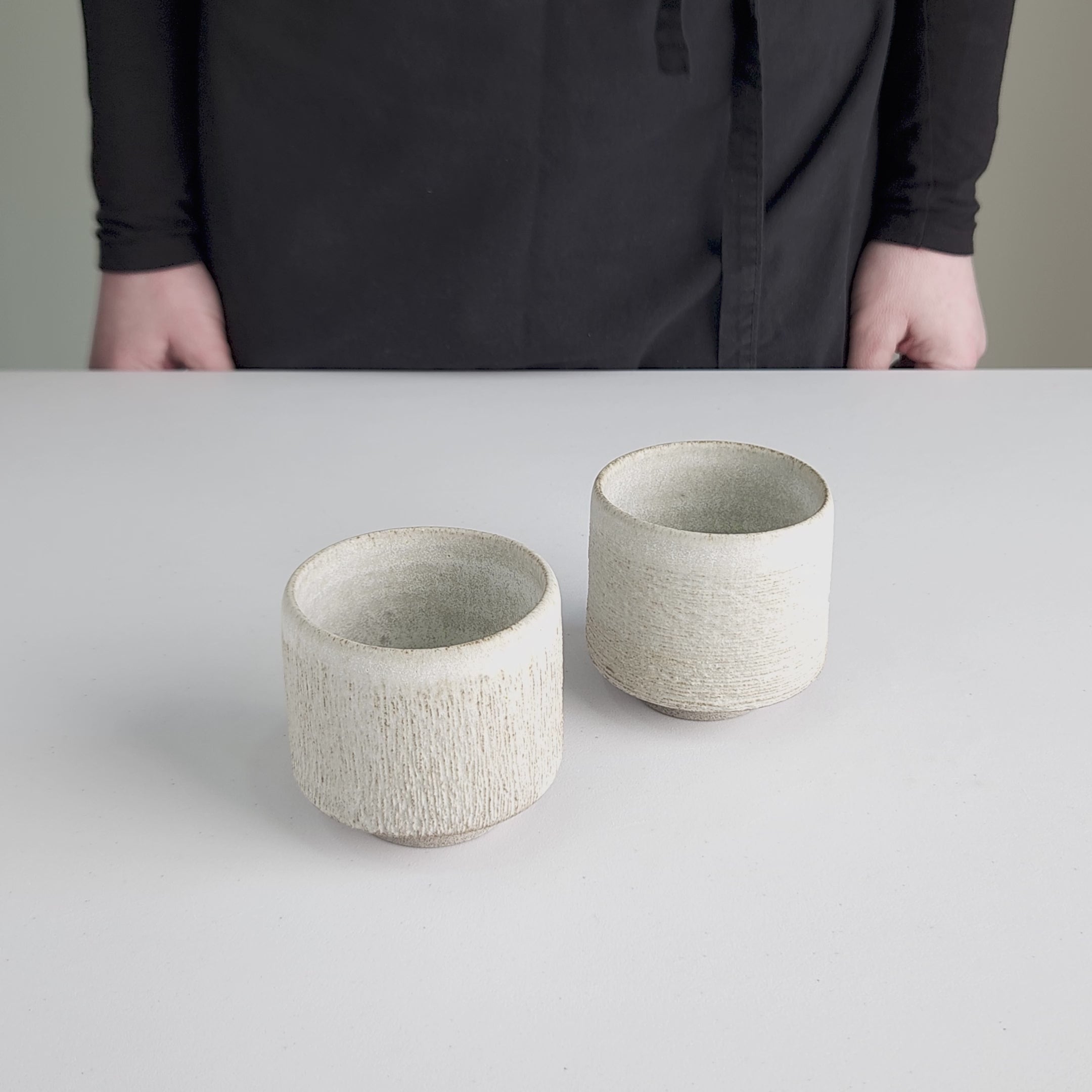The exterior of every mug is carefully carved by hand, giving the surface a tactile texture that makes them visually appealing and pleasant to hold. Finished with a soft white matte glaze, the mugs combine a smooth, calming aesthetic with the natural character of the unglazed bottom. The raw clay base highlights the authenticity of the material and reinforces their artisanal charm.