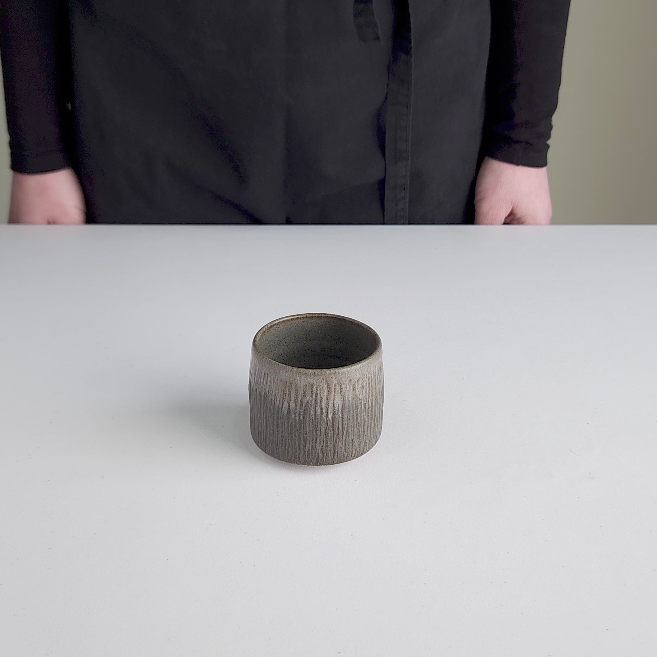 The Hondreana Ale cup is a striking example of artisanal craftsmanship, shaped by hand on the potter’s wheel using rich dark stoneware clay. Its form is defined by flat edges and a stable, slightly raised base, giving it both strength and a refined modern look. The carved exterior adds a unique tactile dimension, creating depth and character that sets it apart from ordinary tableware. A smooth, dark matte glaze completes the design, offering a timeless elegance that fits into both rustic and contemporary interiors.