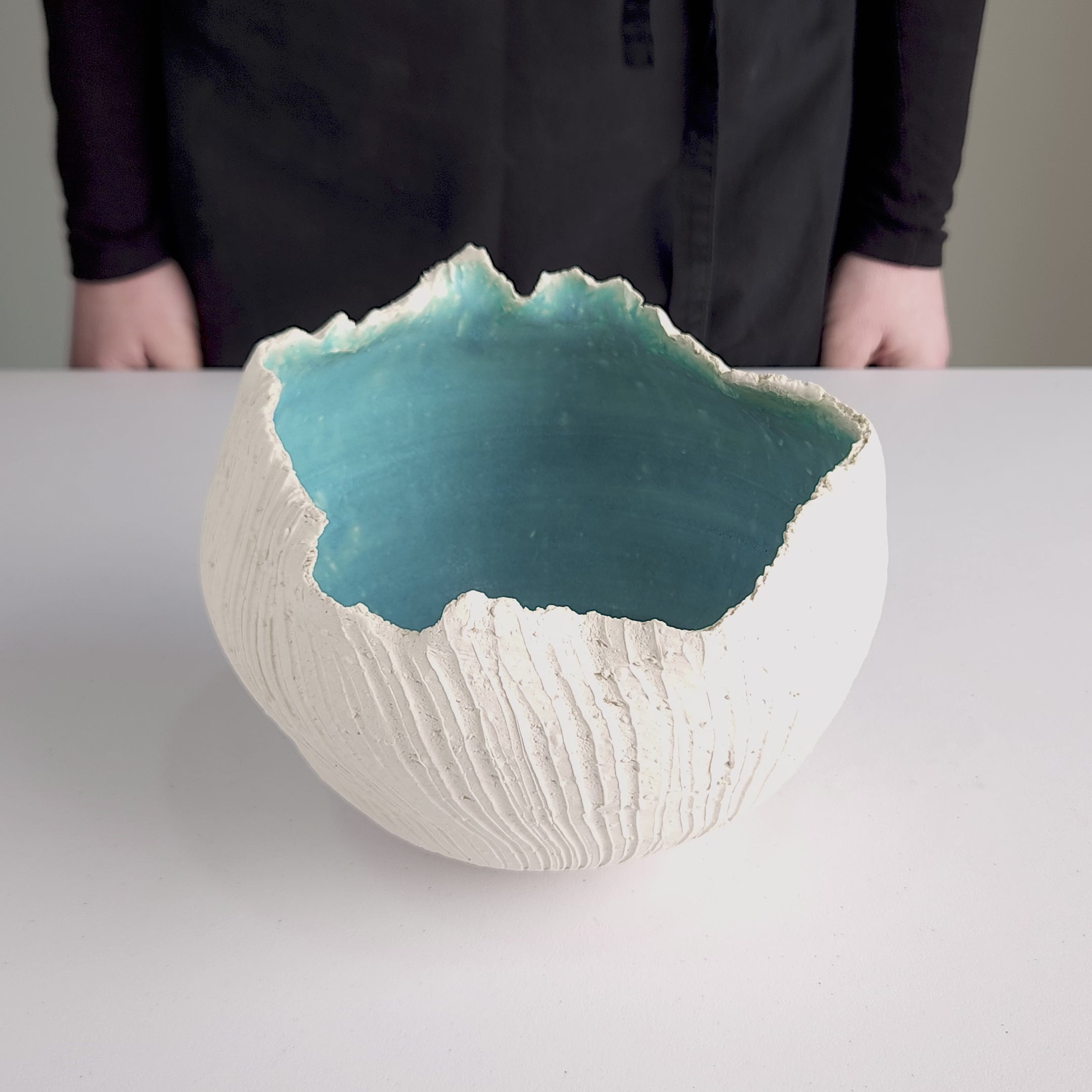 This handmade stoneware vase pairs a matte, textured white exterior with a vivid turquoise glazed interior. The organic, uneven rim and fine vertical lines echo shells and waves, giving the piece a calm, coastal feel. The base is stable, the walls are strong, and the glaze adds a subtle shine that catches the light from every angle.